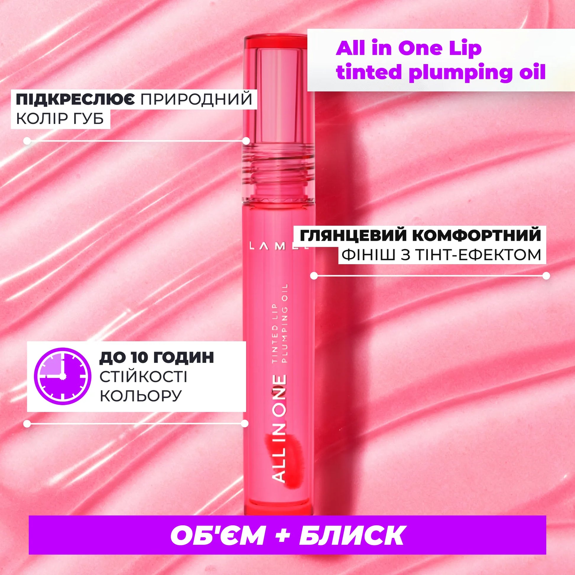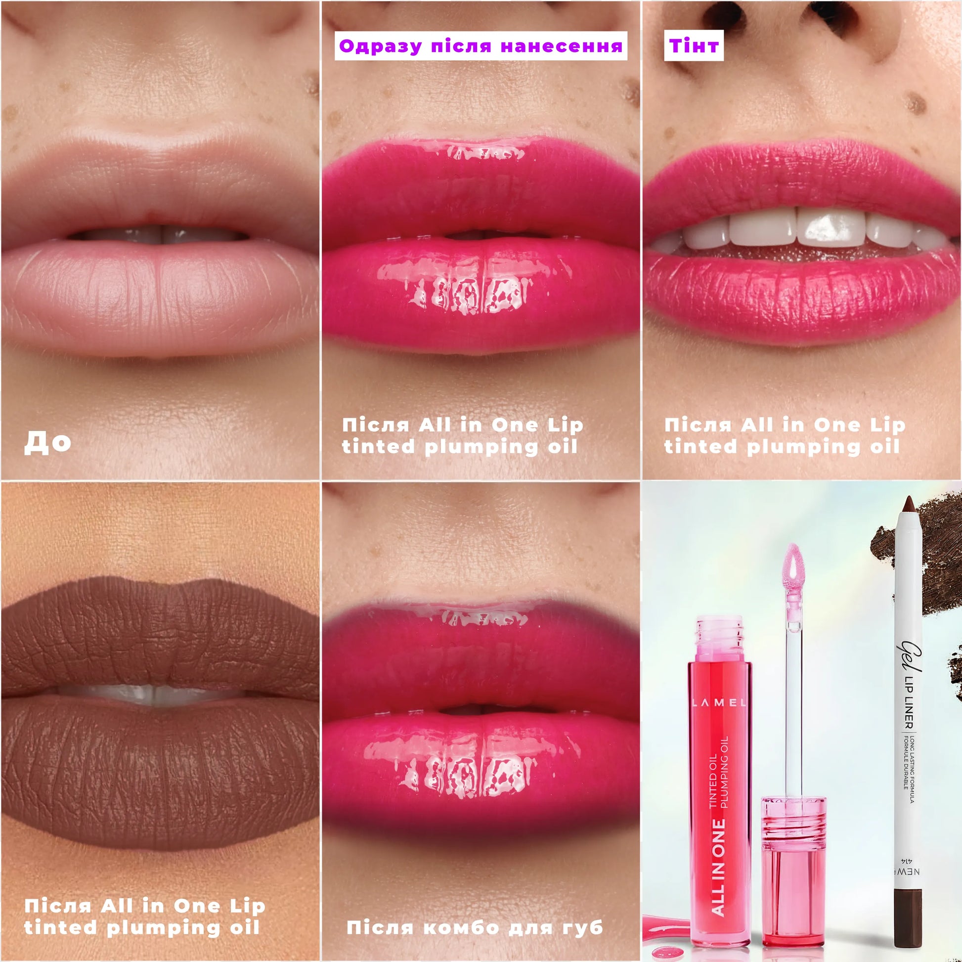 Завершуй All in One Lip Tinted Plumping Oil, який надає губам насичений відтінок, дзеркальний блиск і легкий об’єм до 10 годин.